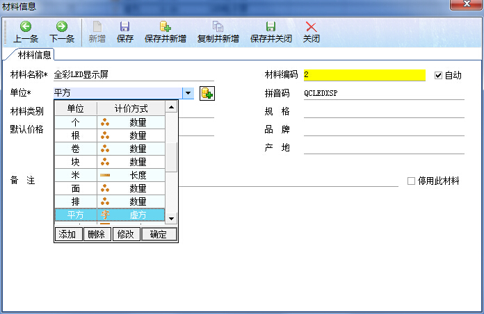 而在我們的廣告公司財(cái)務(wù)軟件中,材料的計(jì)價(jià)方式主要有4種:按面積計(jì)價(jià)、按長度計(jì)價(jià)、按數(shù)量計(jì)價(jià)、按周長計(jì)價(jià),以及現(xiàn)在的LED行業(yè)按照虛方計(jì)價(jià)的。如下圖所示: