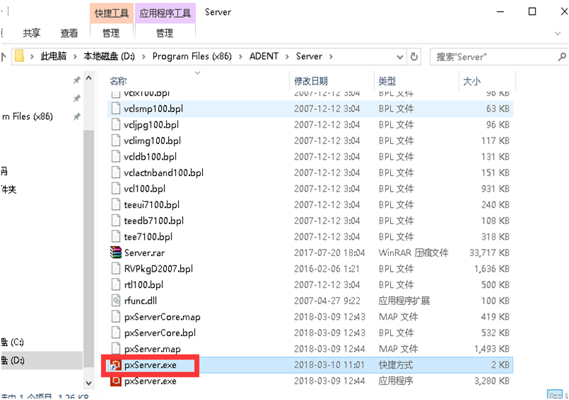 在路徑為D:\Program Files(x86)\ADSTART\Server的文件夾下,找到pxServer.exe這個(gè)文件,同樣也創(chuàng)建一個(gè)快捷方式,并放到系統(tǒng)桌面,如下圖所示: